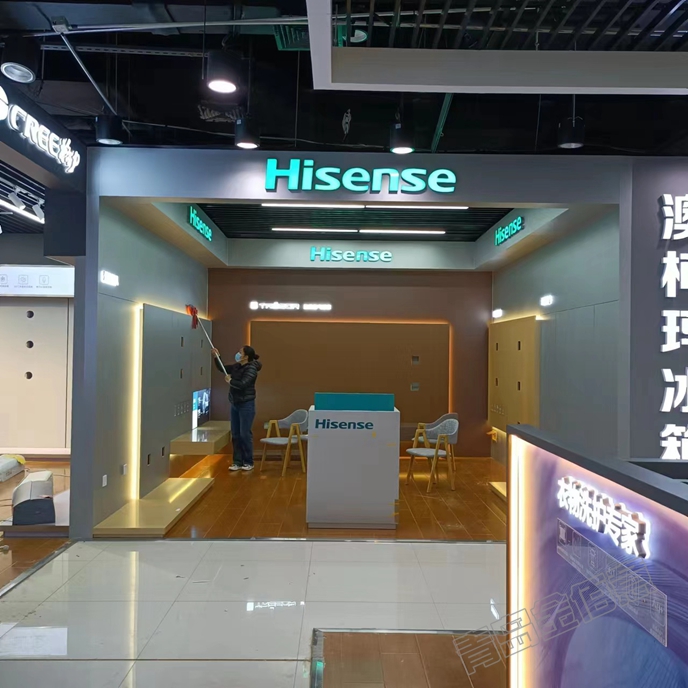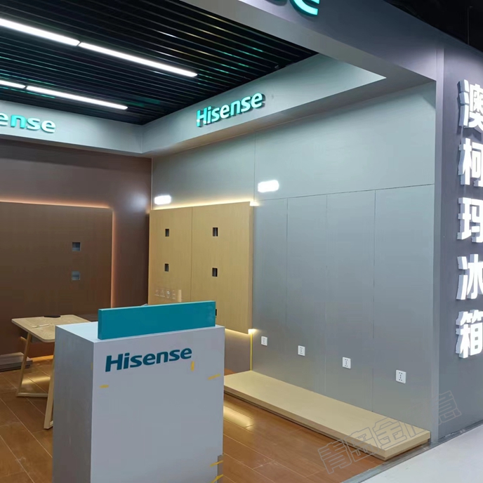 諸城佳樂家海信空調(diào)展廳,E0級刨花板基層,環(huán)保無味,高檔家私寶貼面,色彩紋路逼真,很有檔次;注塑發(fā)光字LOGO,發(fā)光均勻,顏色五偏差。青島金佰意展具提供了設(shè)計(jì)、裝修、展柜制作一條龍服務(wù)。